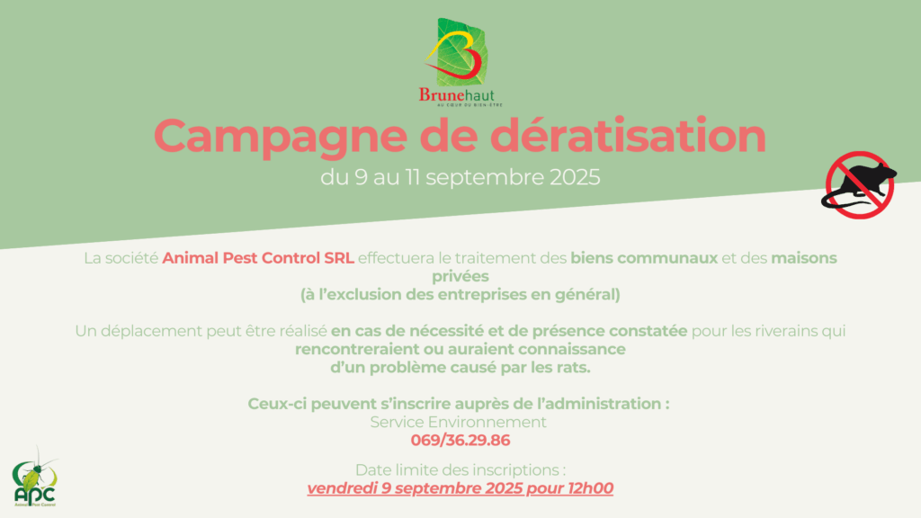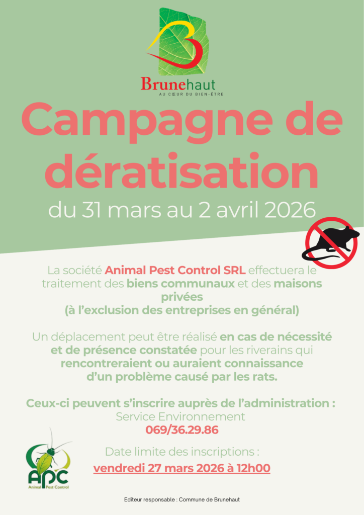La commune organise deux fois par an une campagne de dératisation pour effectuer le traitement de tous les biens communaux et des maisons privées (à l’exclusion des entreprises en général). Le prestataire reste à l’extérieur des habitations.